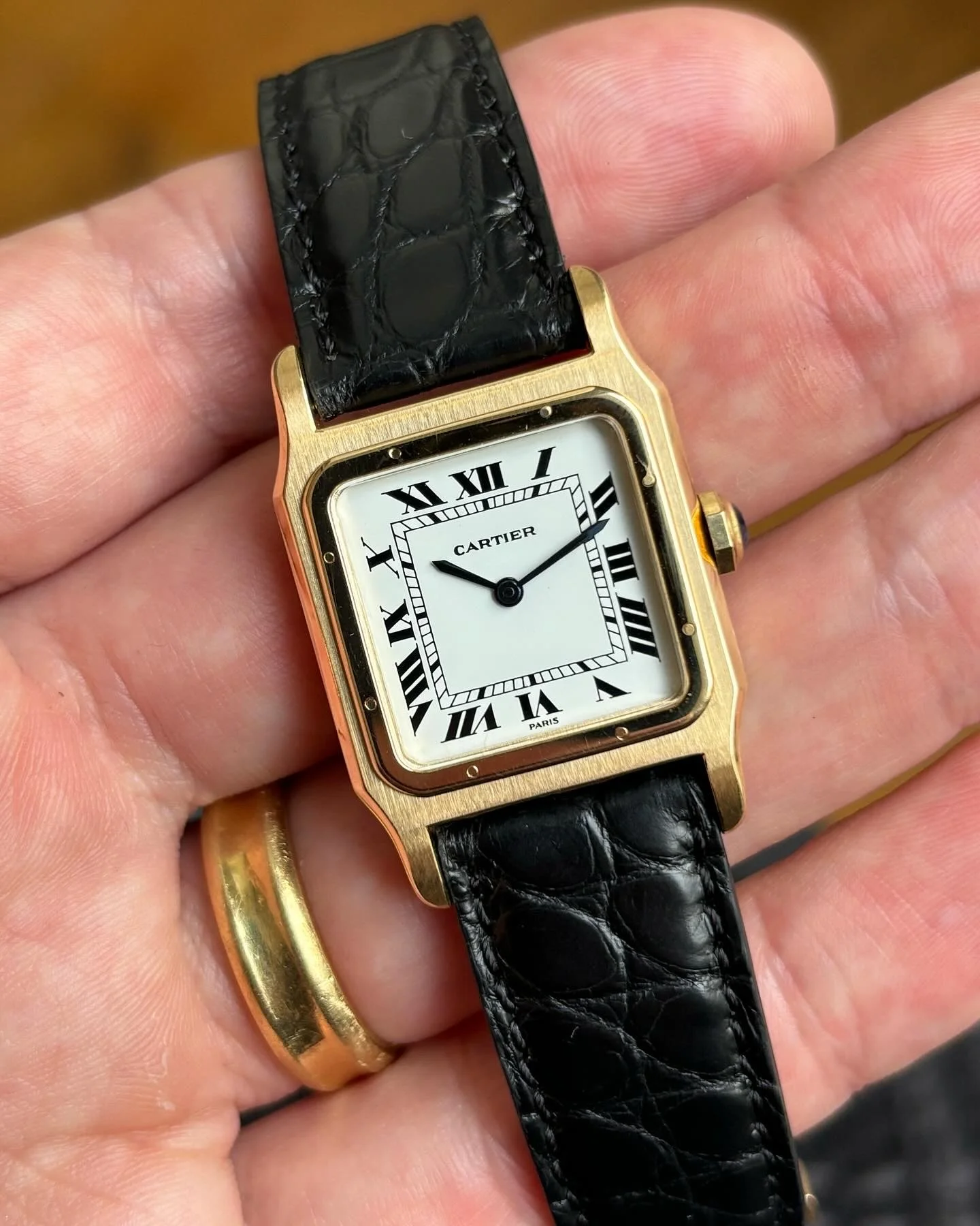 Circa 1970’s with a crispy 18ct gold case measuring 25mm and a gorgeous ‘Paris’ signed dial. In our opinion the essential part to any vintage Cartier on a strap is the original signed deployment clasp! However what we love most about this model is the dreamy octagonal shaped cabochon crown.